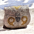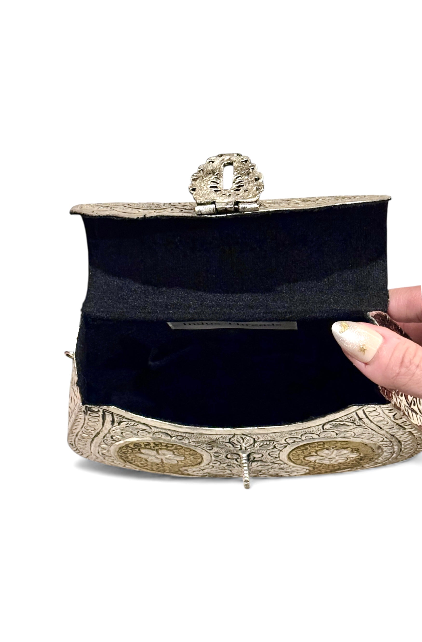 This two toned evening purse is a true work of art, handcrafted with meticulous attention to detail. It showcases a mesmerizing floral design inspired by nature that catch the eye and add a touch of elegance to any outfit.