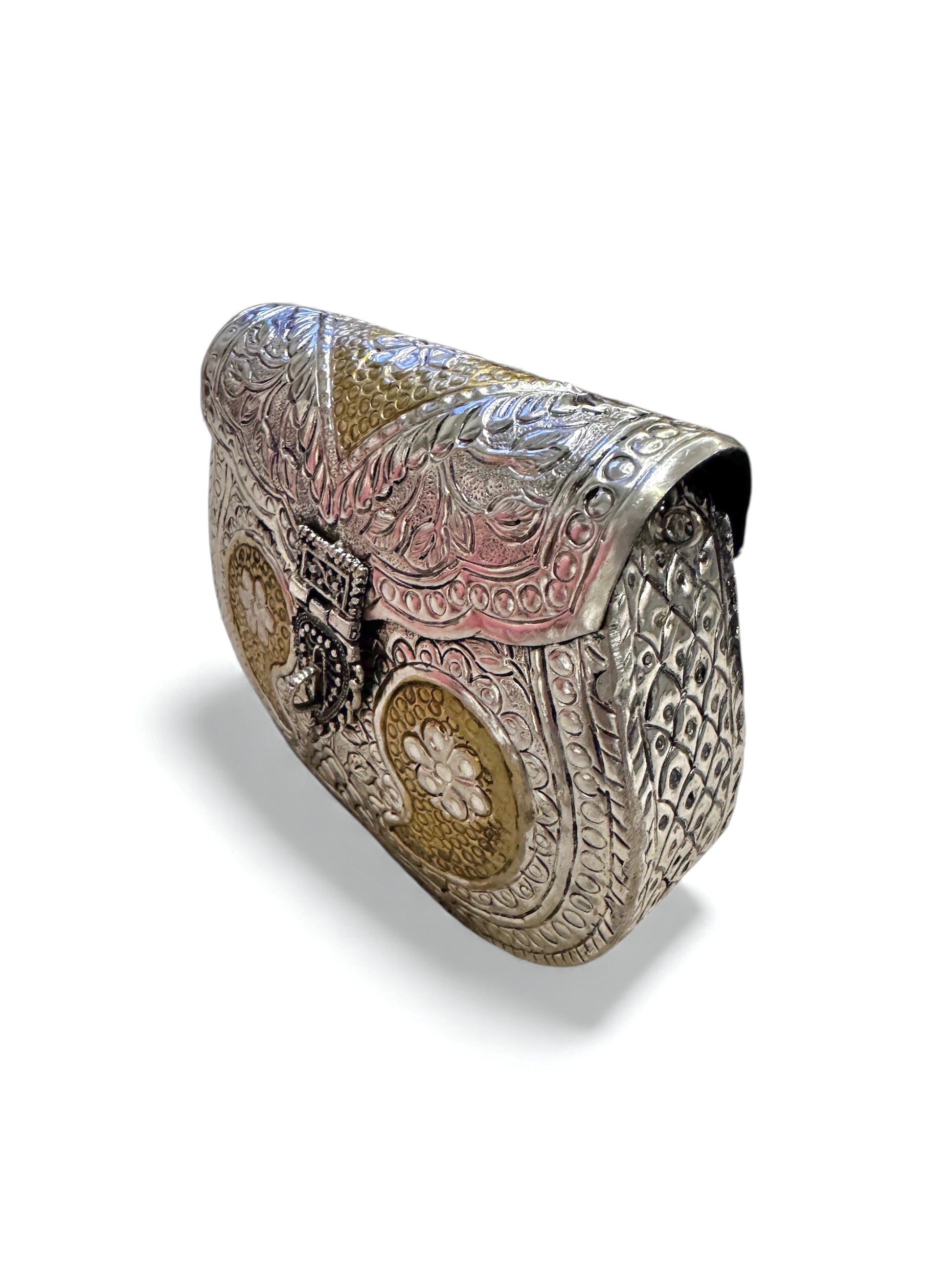 This silver and gold evening purse is designed to be a versatile accessory, perfect for both casual and special occasions. It comes with a detachable chain so you can carry it as a clutch or a crossbody bag. The silver bag perfectly fits your phone, keys and makeup.