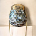 Step into the spotlight with our cylinder shaped Black Mother-of-Pearl Clutch. This unique and luxurious accessory is a masterpiece of modern design and exquisite craftsmanship. Its geometric pattern, meticulously inlaid with iridescent mother-of-pearl and topped off with vintage gold brass - it creates a mesmerizing spectacle that will elevate any ensemble.