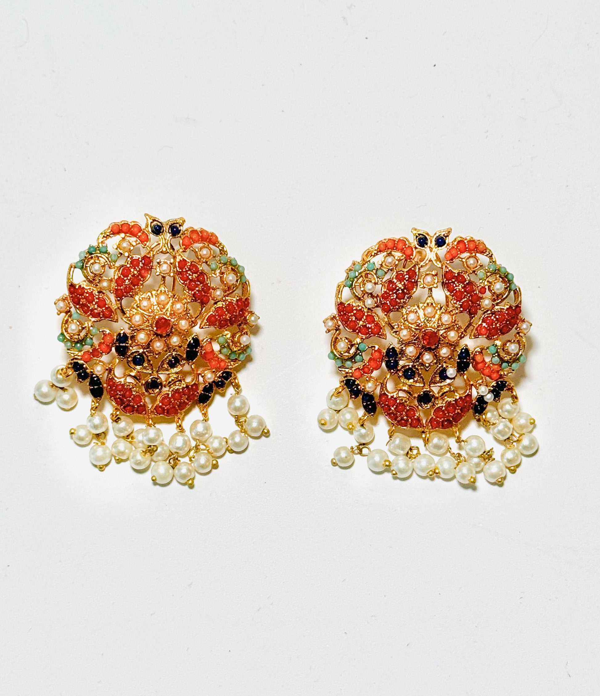 Step into timeless elegance with our Dia Circle Earrings. These gorgeous earrings are a celebration of rich cultural heritage, featuring a vibrant blend of red, green, and black stones. The exquisite design is enhanced by delicate pearl hangings that add movement and grace to each piece..