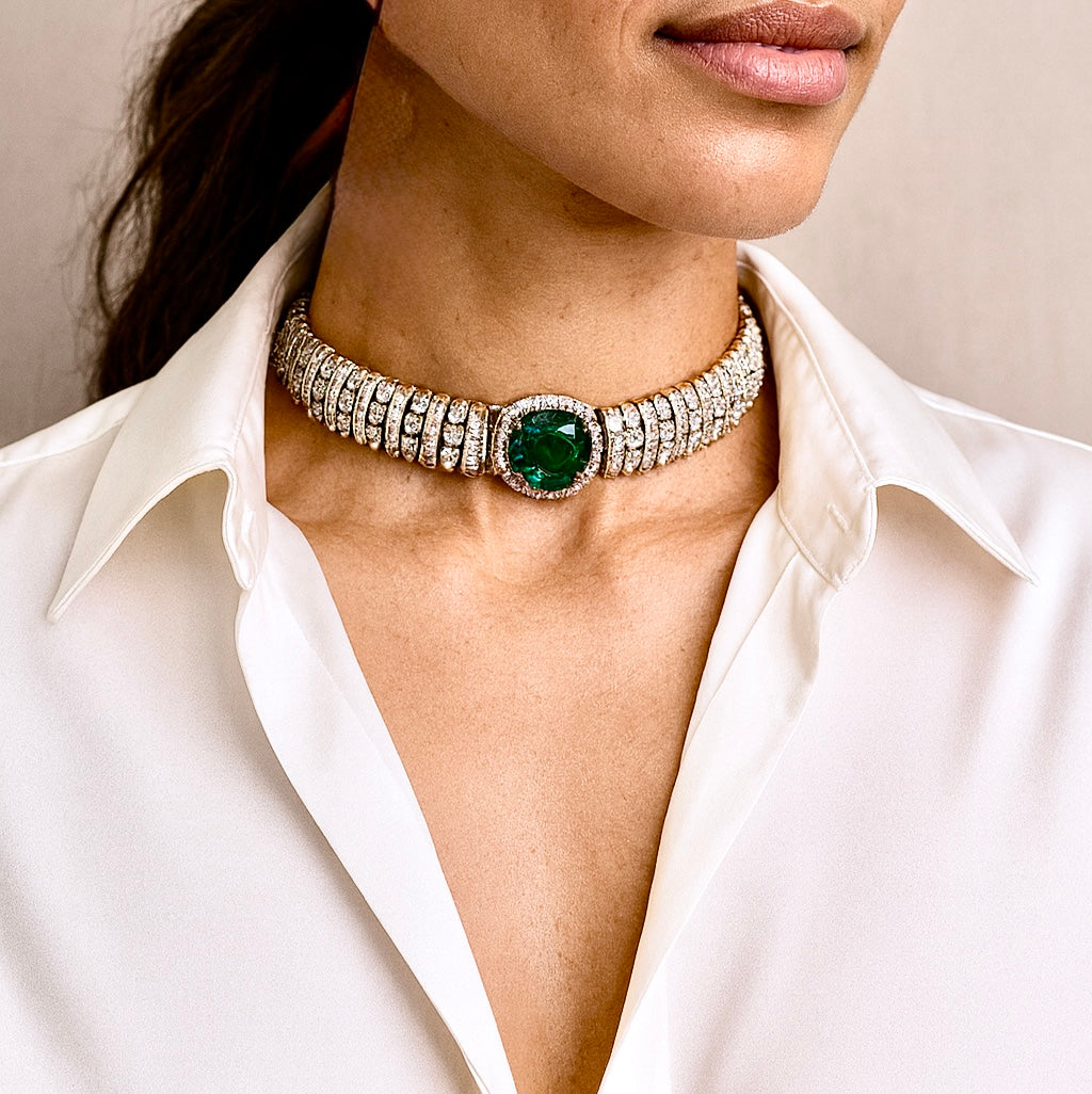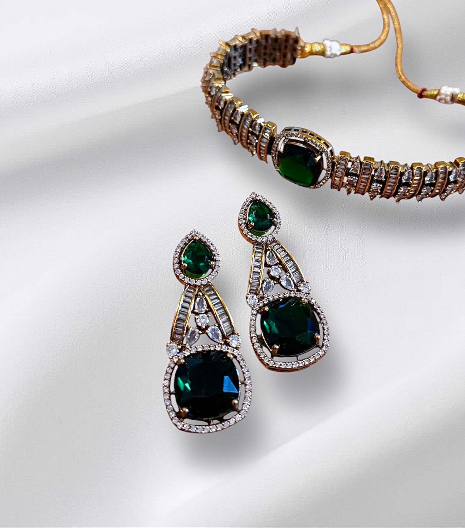 This luxurious choker necklace set is a symbol of strength and beauty, designed to inspire and uplift. Handcrafted with attention to detail - the geometric design and green stone adds a touch of glamour to the outfit.