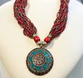 This luxurious one-of-a-kind pendant necklace is a symbol of strength and beauty, designed to inspire and uplift. Handcrafted with attention to detail - the circular mosaic design and blue green color stones add a touch of glamour to the outfit.
