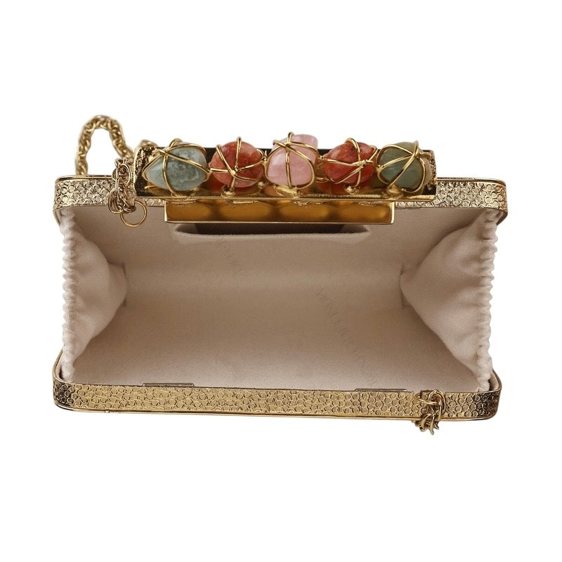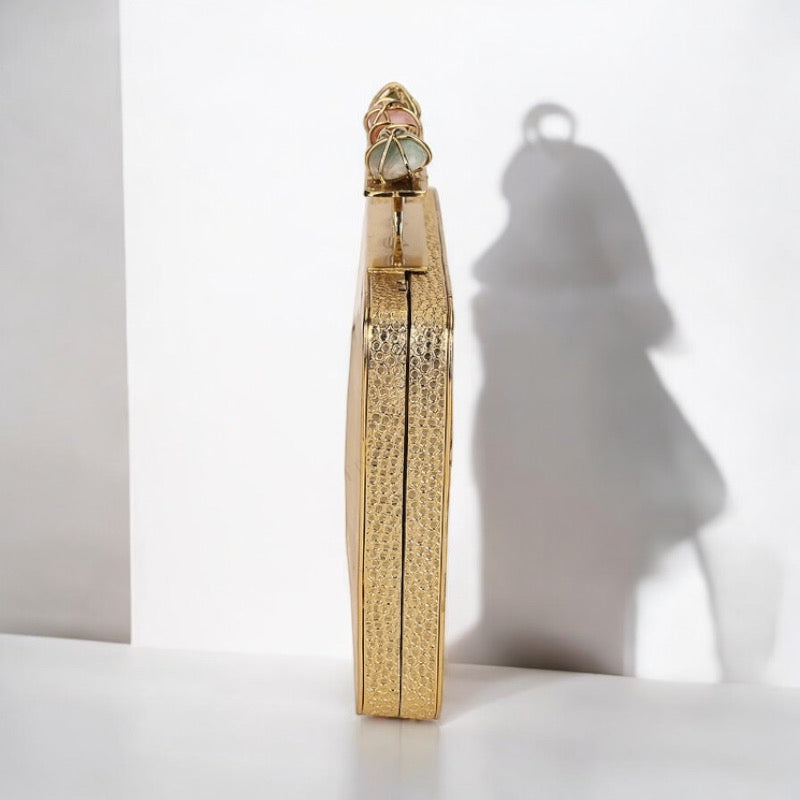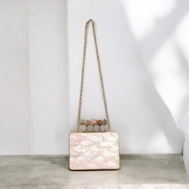 Shine with elegance carrying this beautifully handcrafted mother of pearl purse - a perfect blend of luxury, simplicity and functionality made to elevate any outfit. With its chic and compact design, it's the ideal accessory for any evening out. This elegant clutch bag features a unique four-finger ring handle adorned with tumbled natural stones. It perfectly fits your phone and other items.