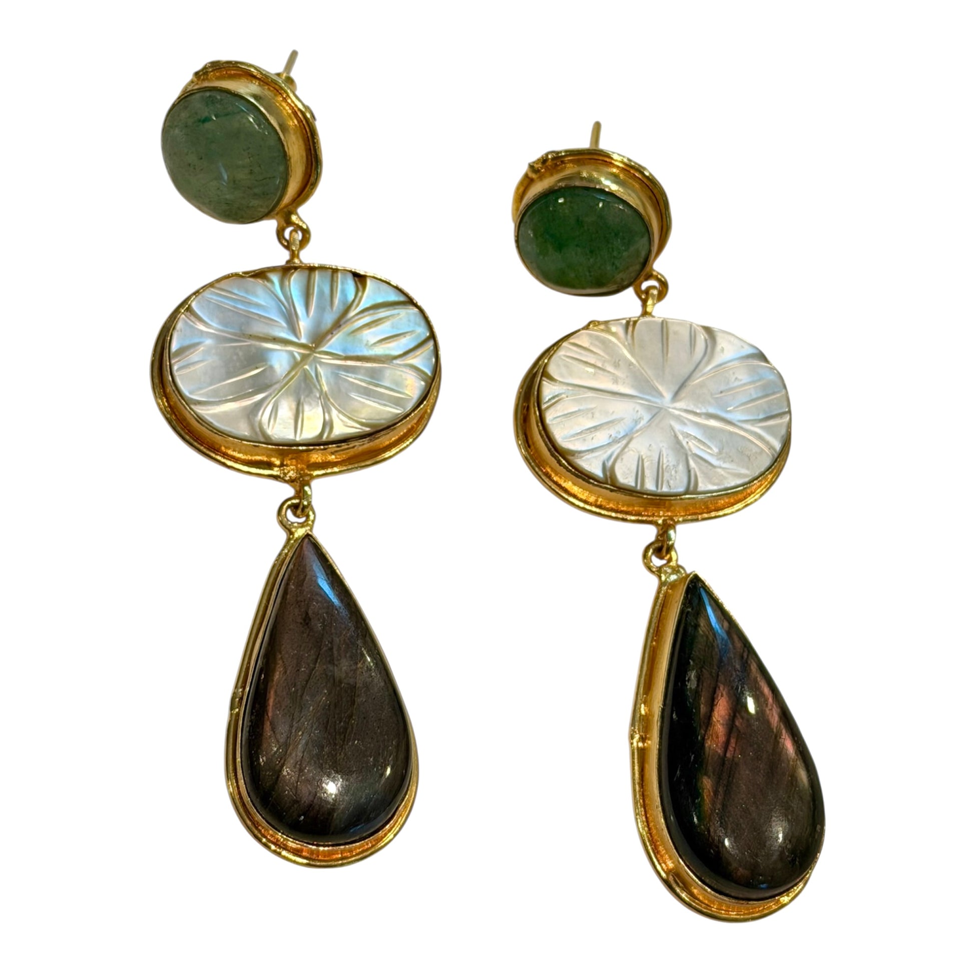 Long gold electroplated earrings featuring semi‑precious onyx and mother‑of‑pearl stones, rich in texture and shine.