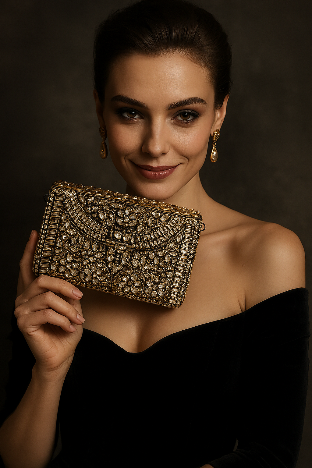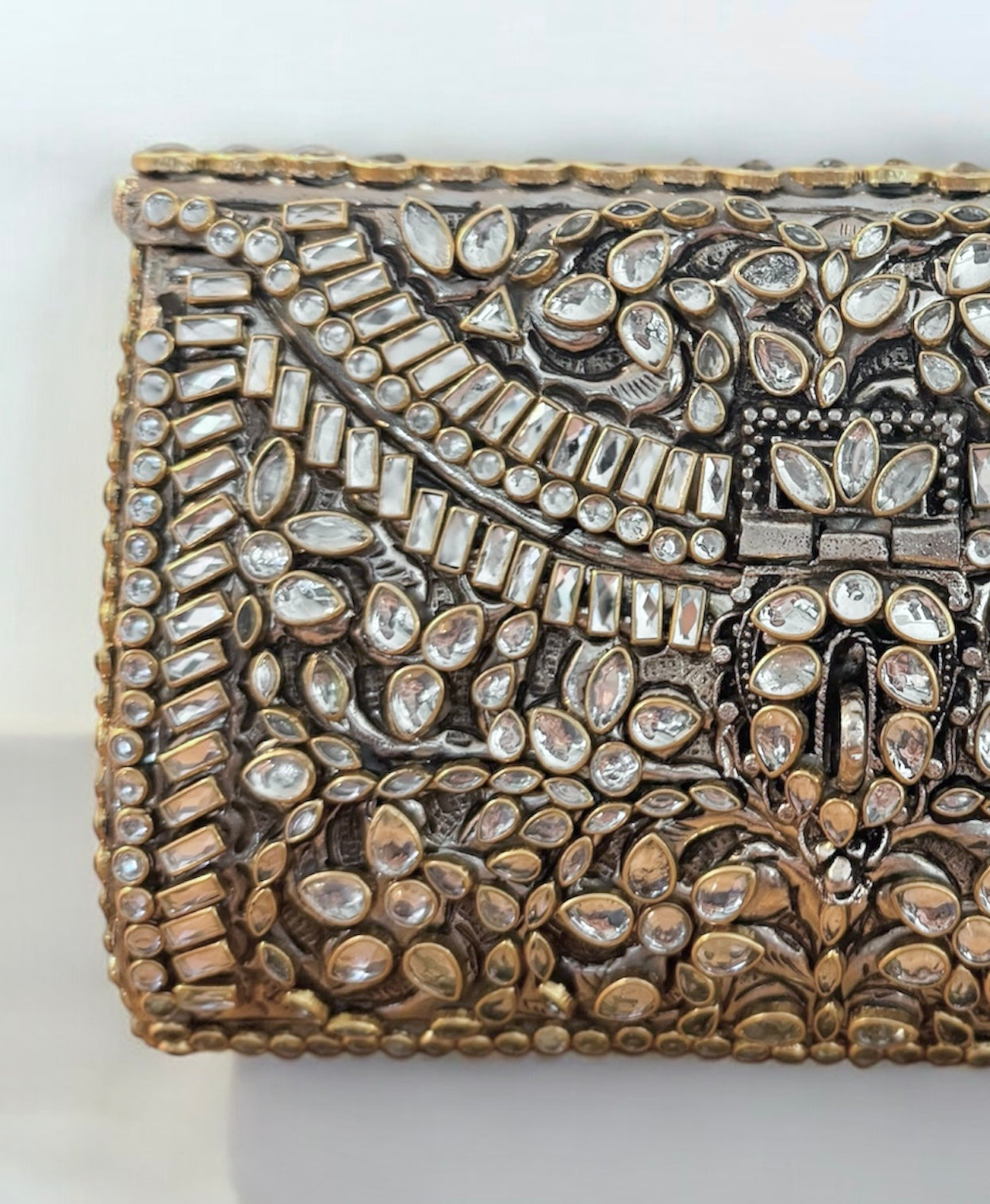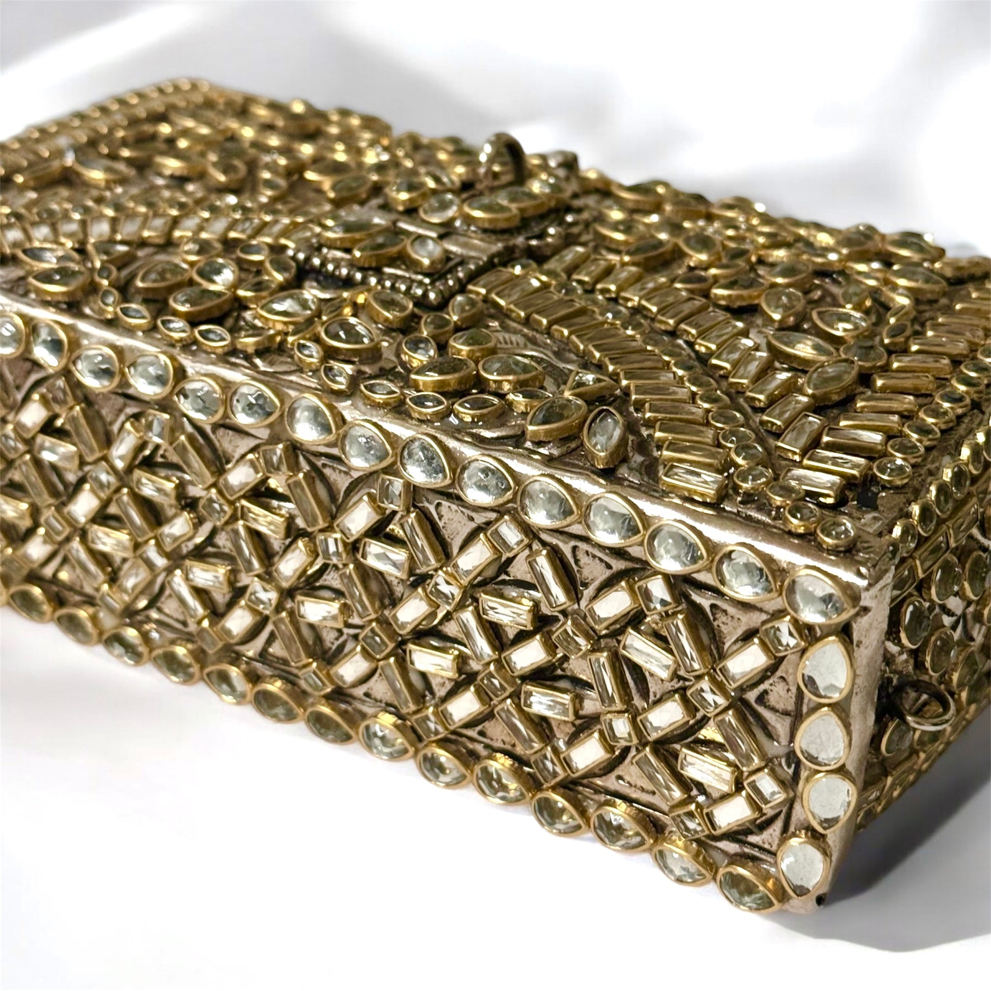 A luxurious handcrafted box bag is an exquisite addition to your evening wardrobe, perfect for making a stylish statement. This antique inspired purse is not just an accessory, but a wearable work of art. Adorned with stones - this beauty is surely a conversation starter.