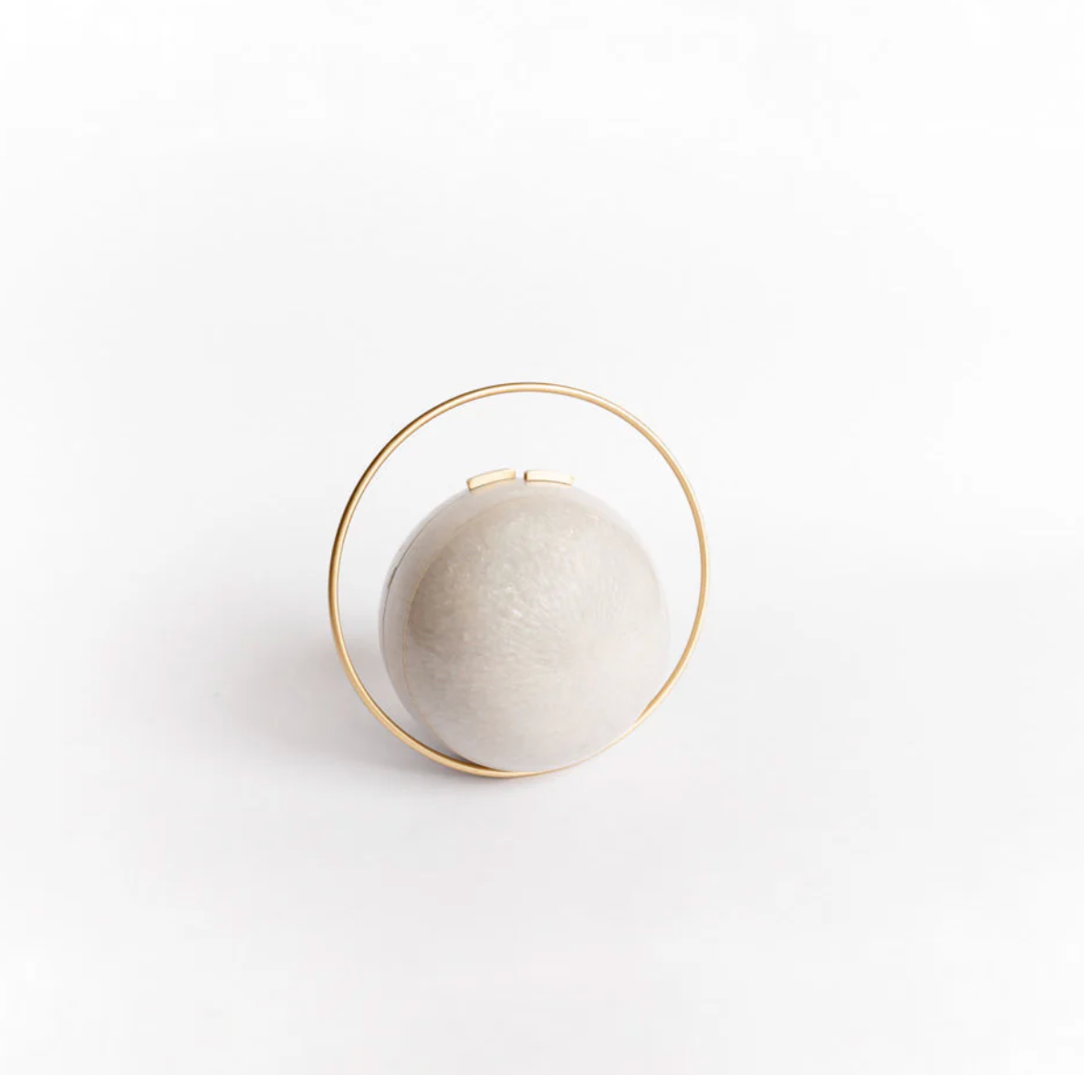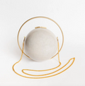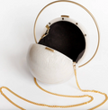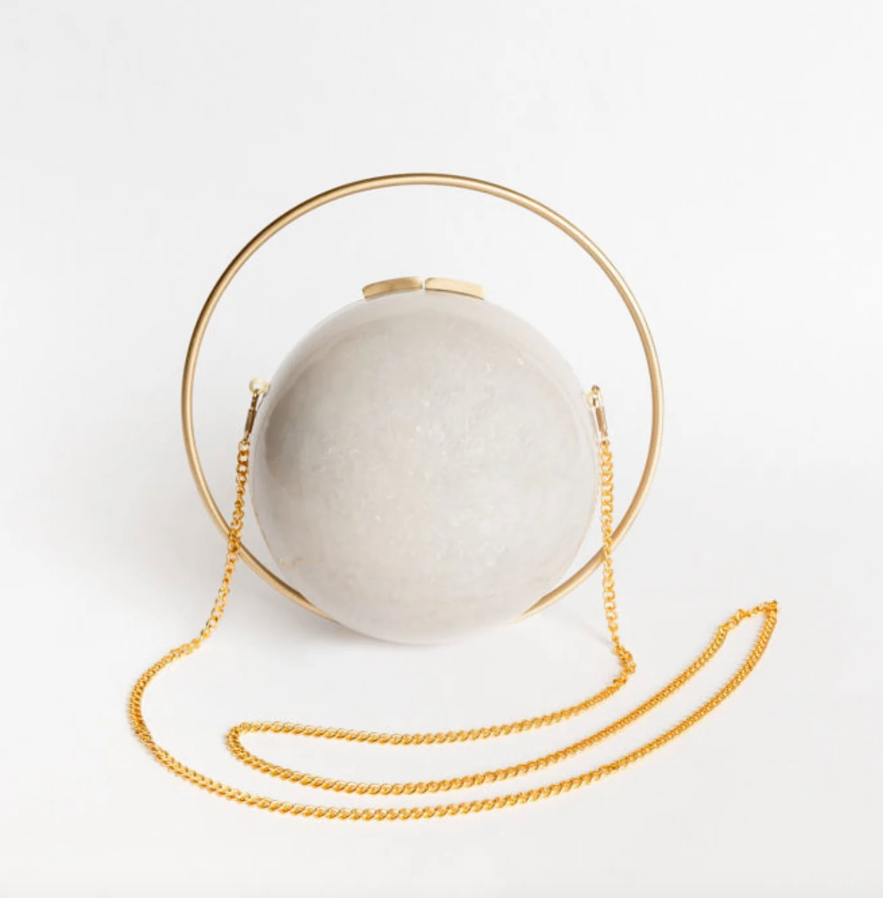 Elevate your style with our handcrafted artisanal evening bag, a true statement piece designed for modern elegance. Inspired by timeless geometry, this round clutch purse is meticulously crafted by skilled artisans, featuring a sleek metal frame and a glossy orb finish.
