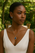 This luxurious tanzanite quartz pendant set is a symbol of strength and beauty, designed to inspire and uplift. Handcrafted with attention to detail, it is a perfect combination of confidence and sophistication. The geometric design and blue color adds a touch of glamour. The necklace comes with stud earrings.