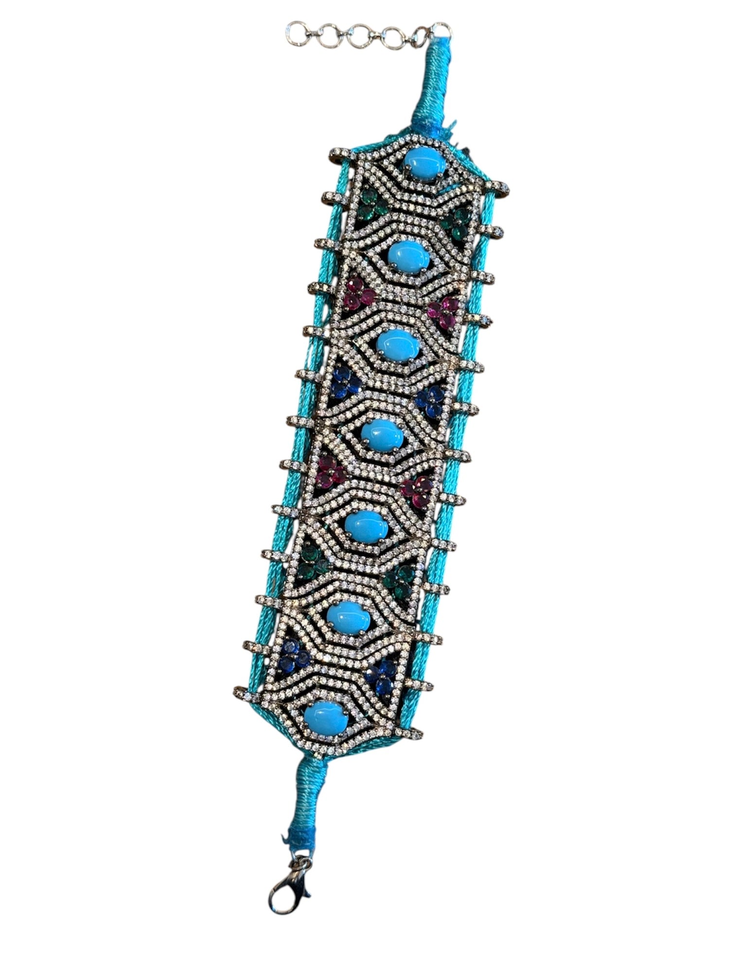 Quartz semi‑precious stone bracelet highlighted with compressed turquoise, set in silver and finished on a durable adjustable thread. A timeless design with a subtle pop of color.
