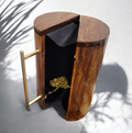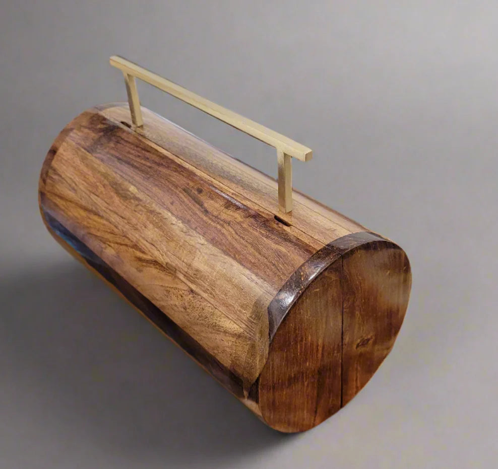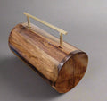 This cylindrical antique inspired wooden purse is handcrafted from recycled sheesham wood featuring a sleek cylindrical shape and a brass handle for a touch of elegance. It comes with a detachable chain for versatile wear as a clutch or crossbody bag.